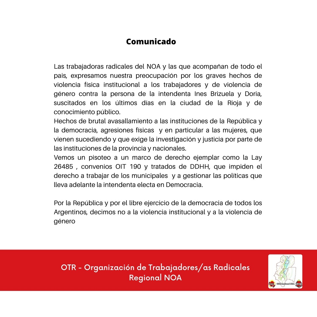 Las trabajadoras radicales del NOA y las que acompañan de todo el país, expresamos nuestra preocupación por los graves hechos de violencia física institucional a los trabajadores y de violencia de género contra la persona de la intendenta Inés Brizuela y Doria, suscitados en los últimos días en la ciudad de la Rioja y de conocimiento público.