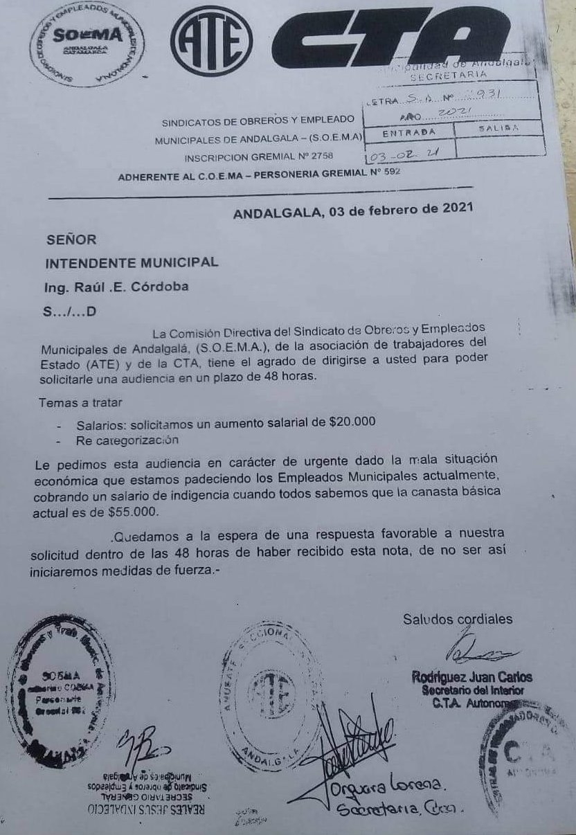 En el escrito, dejaron plasmado un incremento salarial de $20.000, además de una recategorización. “Le pedimos esta audiencia en carácter de urgente dado la mala situación económica que estamos padeciendo os empleados municipales actualmente, cobrando un salario de indigencia cuando todos sabemos que la canasta básica actual es de $55.000”, señala la nota dirigida al jefe comunal.