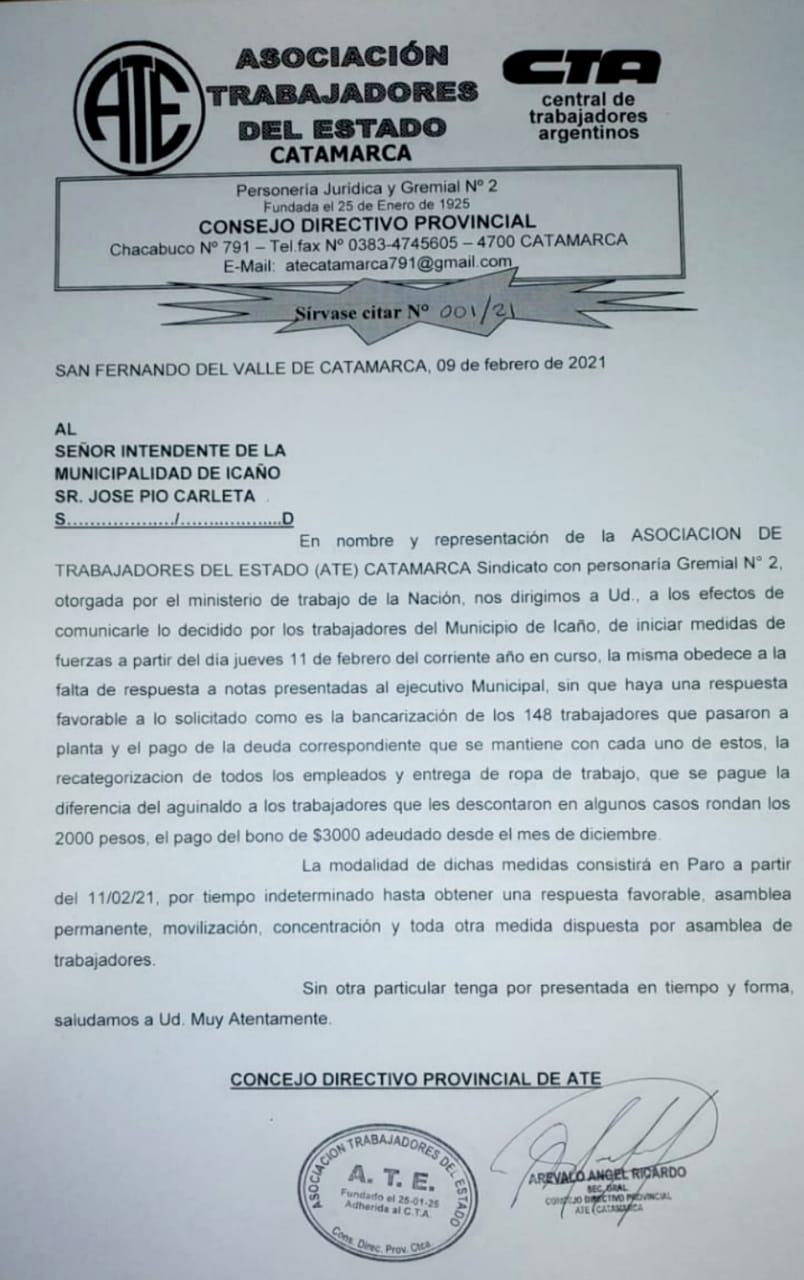 Además, reclaman pago de deuda que el municipio de Icaño mantiene con ellos, la recategorización de todos los empleados y entrega de ropa de trabajo.
