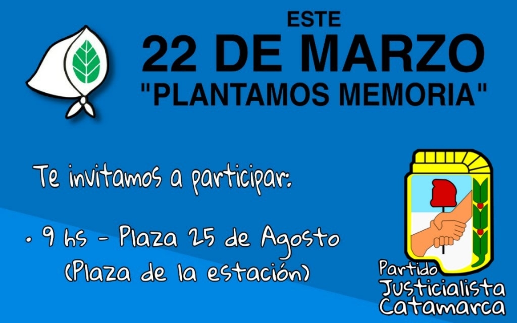 Compañeras y compañeros: Este lunes 22, a las 9 hs., el PARTIDO JUSTICIALISTA llevará a cabo la jornada "PLANTAMOS MEMORIA", en el paseo 25 de Agosto (plaza de la ESTACIÓN), a 45 años del golpe genocida.