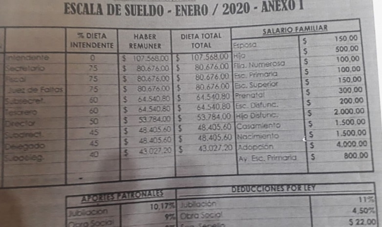 Además, expusieron la escala salarial vigente, en la que se puede apreciar la abrupta diferencia entre los suelos de la planta política del municipio y los empleados, que llegan a cobrar $19.000.