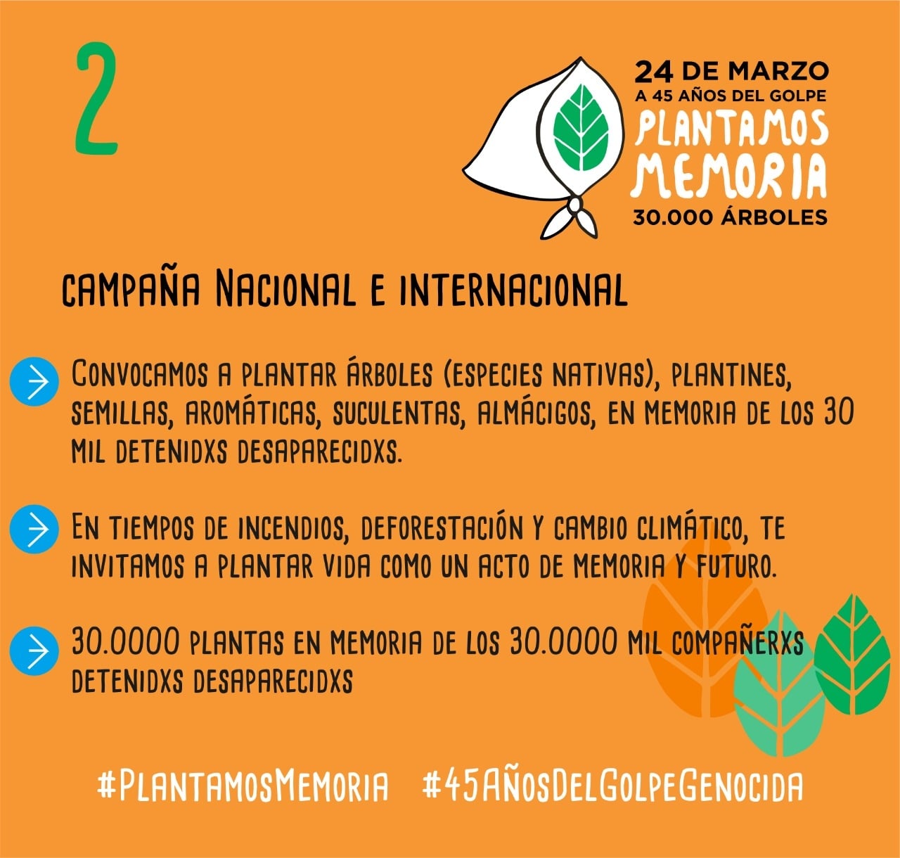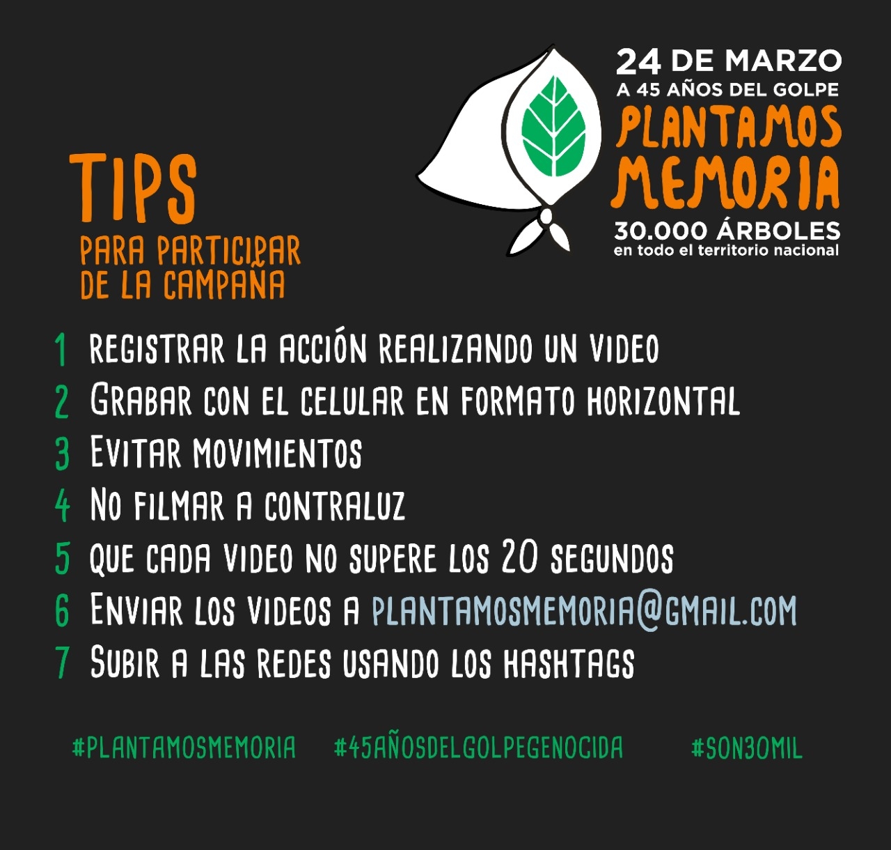 En un año en que no se pueden realizar concentraciones masivas, se realiza esta propuesta para seguir cuidándonos y cuidando nuestro hábitat, para construir futuro. El registro de las acciones es importante para que el 24 de marzo, las redes sociales se inunden de este mensaje de memoria y esperanza, acompañado por los hashtags: