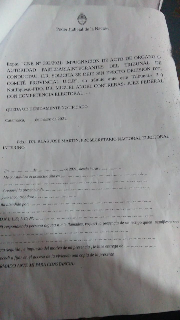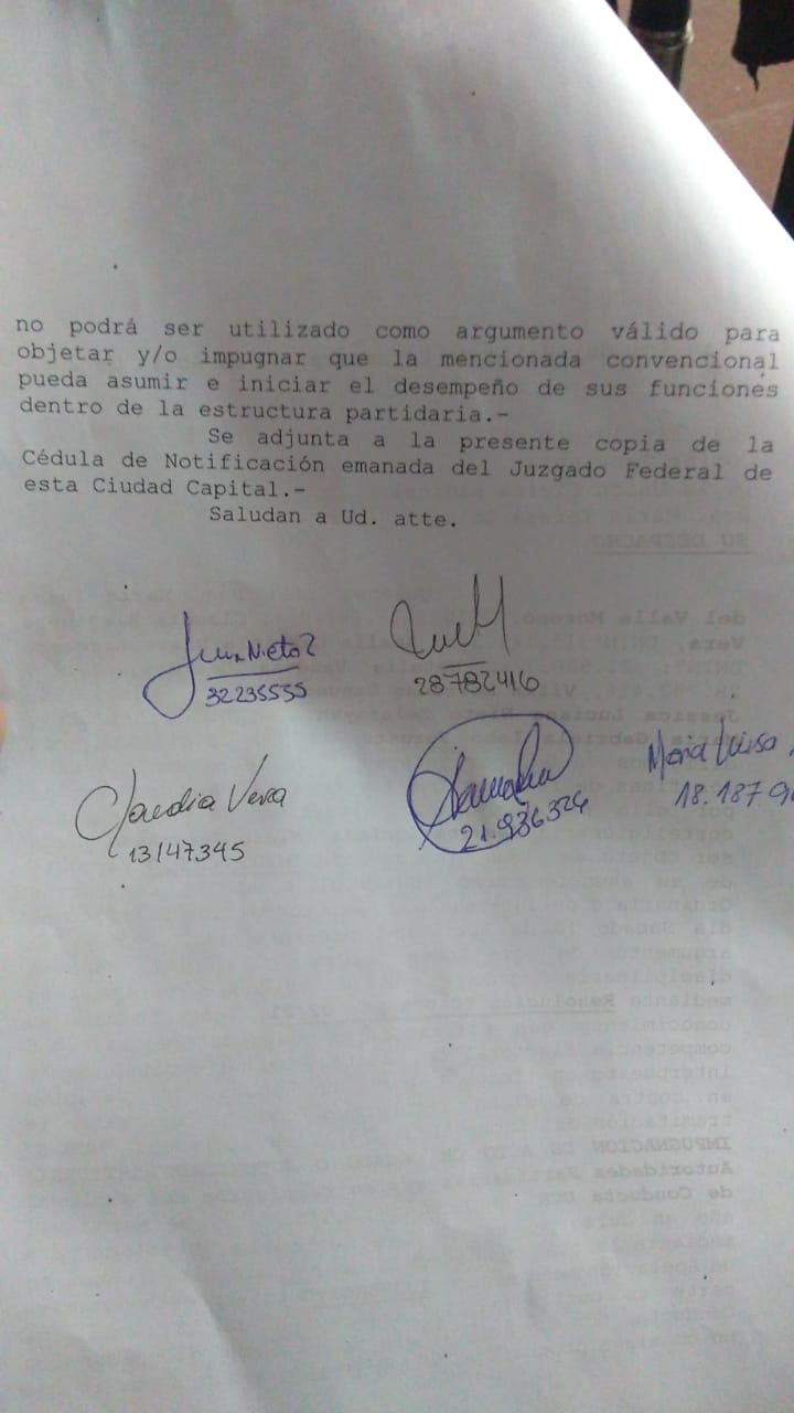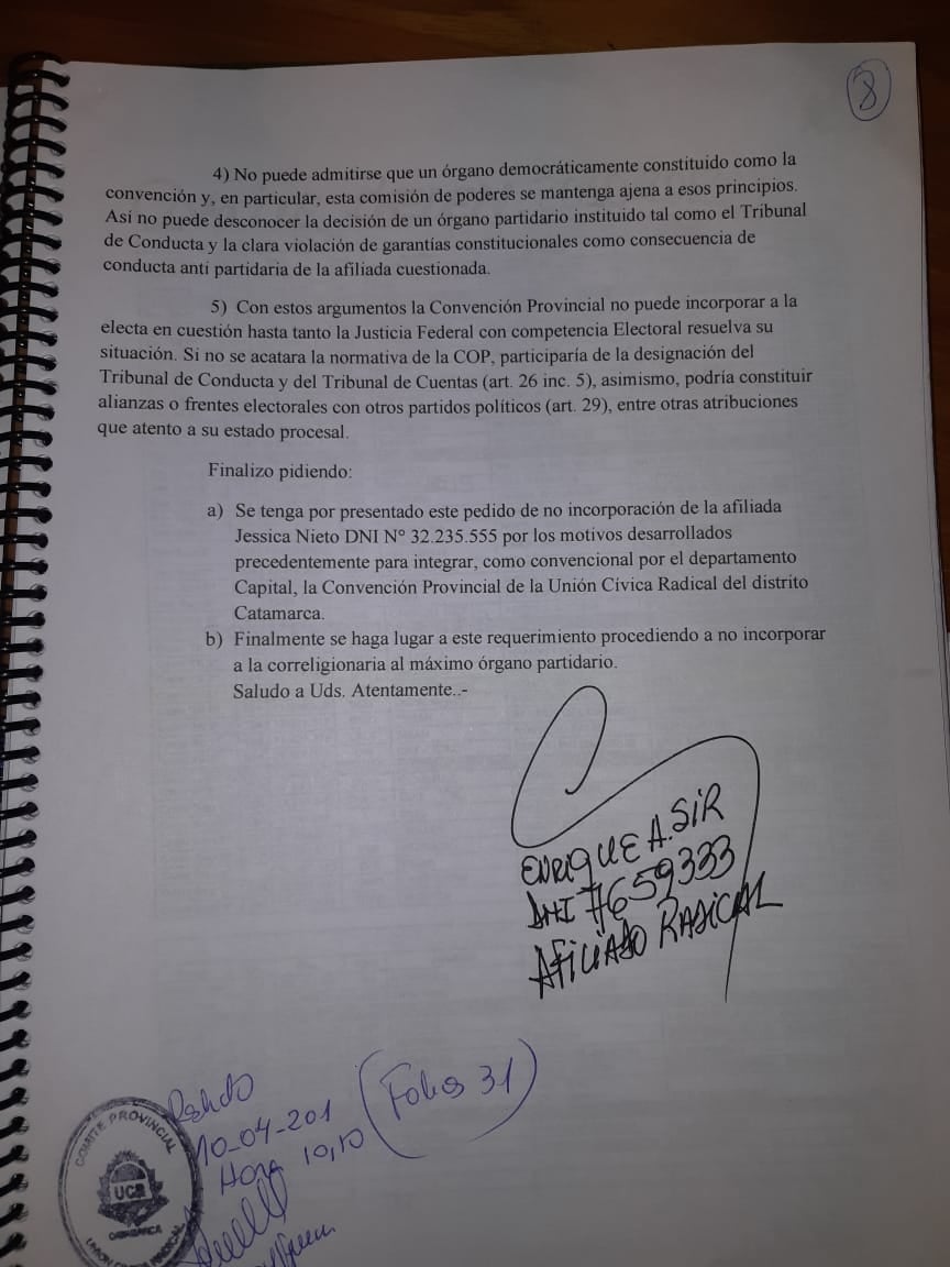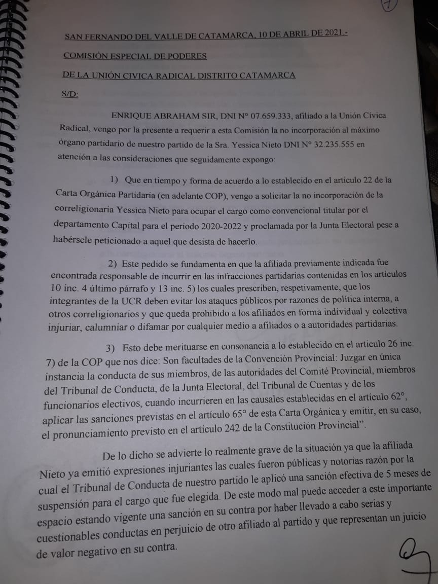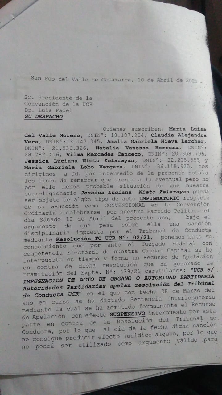 De esta manera, le pide a la Convención Provincial Radical no incorporar a Nieto como convencional de la Capital.