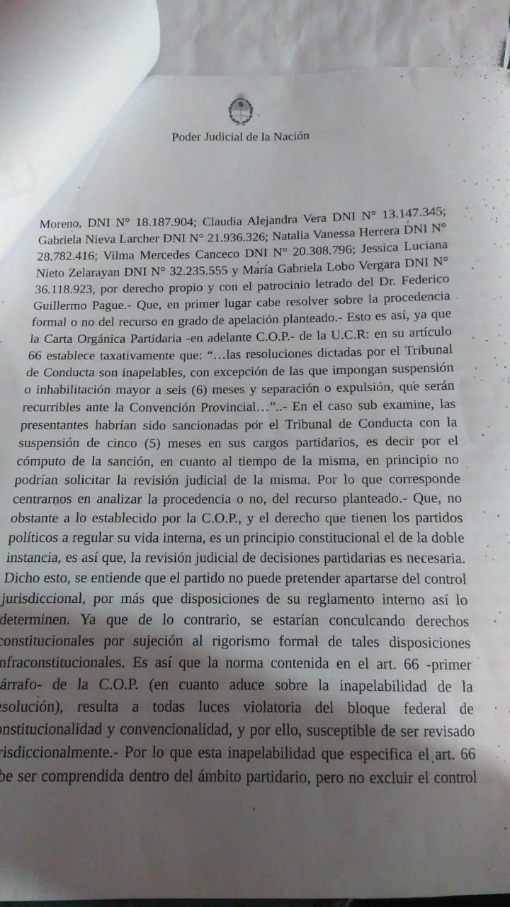 A través del documento presentado por el dirigente Enrique Sir, acusa a la mujer radical de incurrir en “infracciones partidarias” como “injuriar, calumniar o difamar” a dirigentes del mismo partido.
