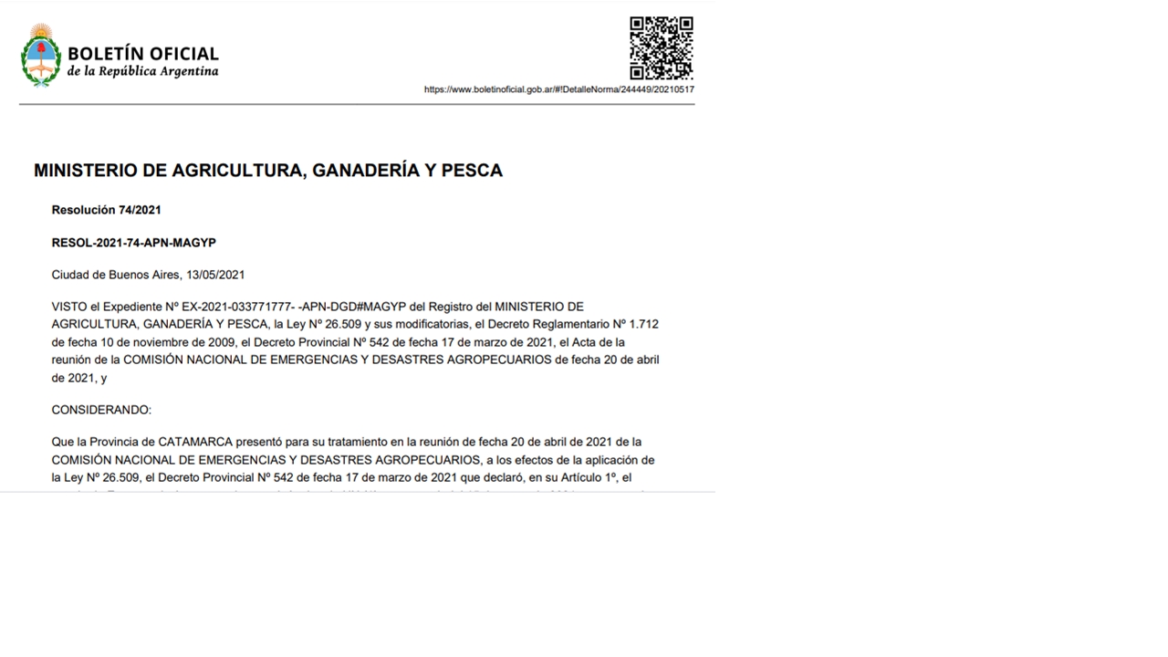 La emergencia es por el plazo de un año desde el 15 de enero de 2021, según consta en la Resolución 74/2021 que lleva la firma del ministro de Agricultura, Ganadería y Pesca de la Nación Luis Eugenio Basterra.