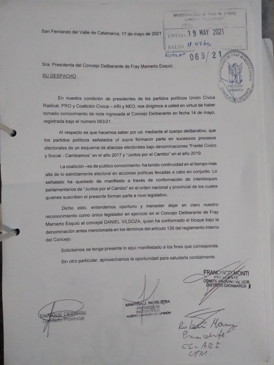 A través de una nota, deja expuesta a Segura, a quien desconocen como integrante del bloque radical en el CD, y aseguran que el único edil que pertenece a ese sector es Daniel Vildoza.