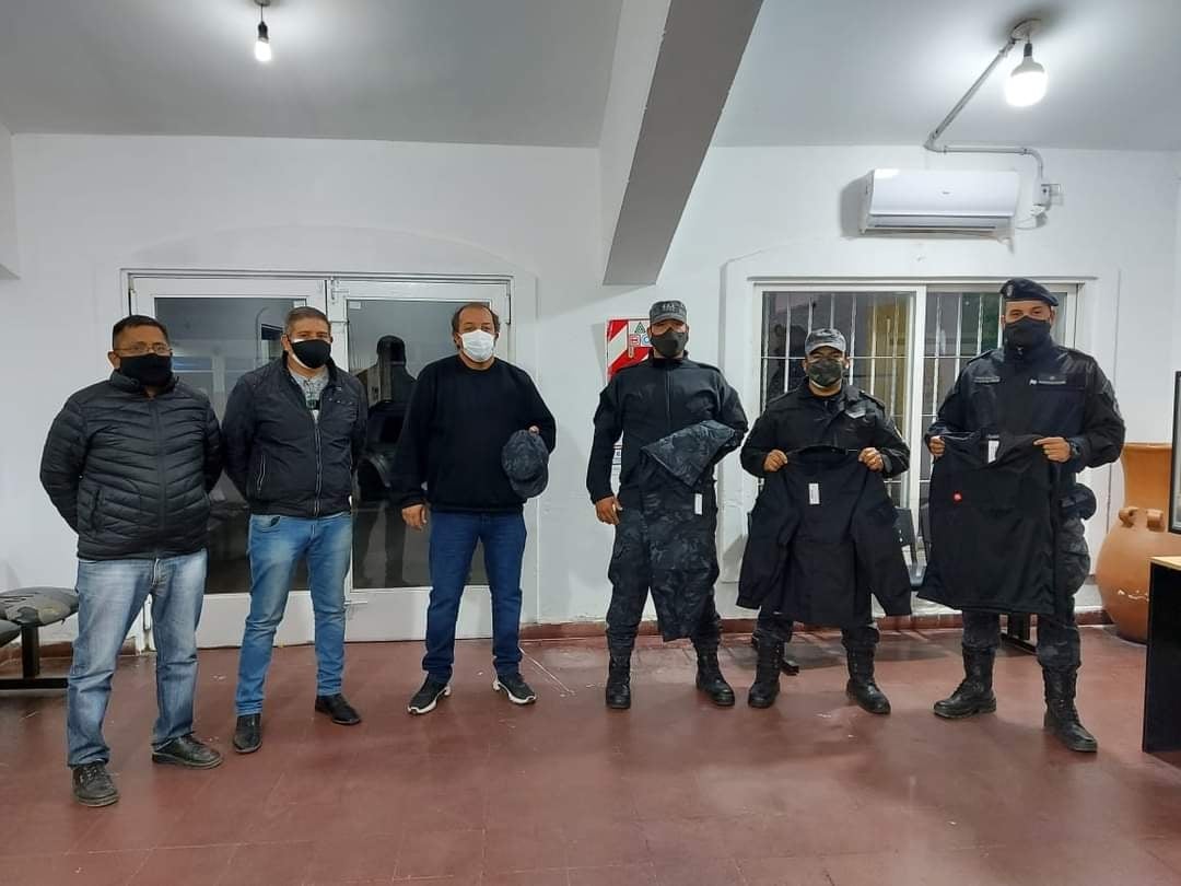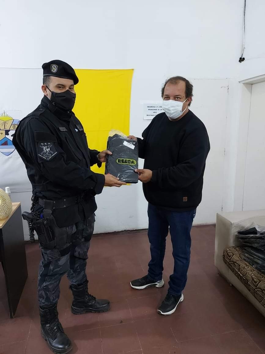 El jefe comunal estuvo acompañado por Comisario Mayor Cejas, Comisario Condori y miembros del Grupo de Intervención Rápida de la Unidad Regional N°2, quienes recibieron por parte del municipio la donación de 12 equipos completos de indumentaria reglamentaria.