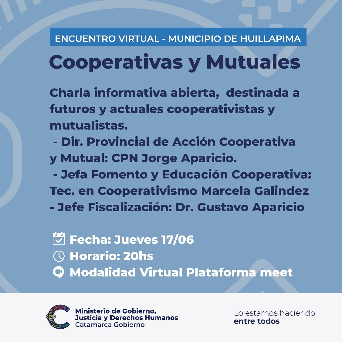 La primera jornada tendrá lugar este jueves a las 20 horas, destinada al personal de la Municipalidad de Huillapima. De este encuentro, participarán el director de Acción Cooperativa y Mutual, Jorge Aparicio; la jefa de Fomento y Educación Cooperativa, Marcela Galíndez, y el jefe del Departamento de Fiscalización, Gustavo Aparicio. Serán los encargados de capacitar, orientar y responder a las inquietudes de los participantes, mediante el acompañamiento y moderación de los funcionarios del municipio interviniente.