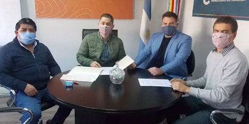 De la firma participaron el intendente departamental Julio Taritolay, el subgerente de Medio Ambiente, Higiene y Seguridad en Posco, Italo Francile, el representante legal de la minera Gerardo Monti y el director Provincial de Promoción Social Minera Enzo Araya.