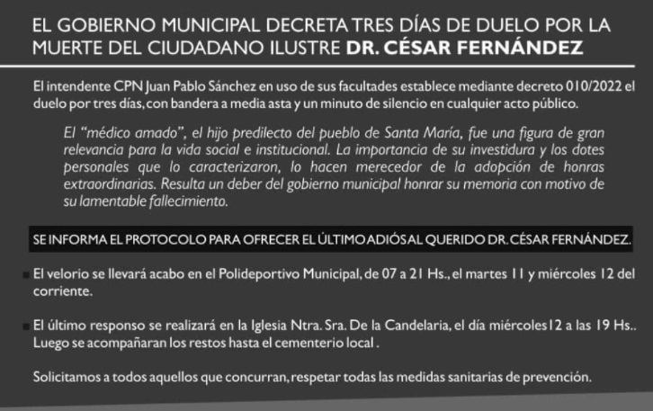 "El 'médico amado', el hijo predilecto del pueblo de Santa María, fue una figura de gran relevancia para la vida social e institucional. La importancia de su investidura y los dotes personales que lo caracterizan, lo hacen merecedor de la adopción de honras extraordinarias. Resulta un deber del gobierno municipal honrar su memoria con motivo de su lamentable fallecimiento", publicó la Municipalidad de Santa María.