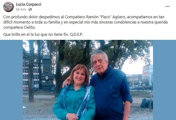 "Las y los que formamos parte del Partido Justicialista de Catamarca despedimos con profundo dolor al Compañero Ramón “Flaco” Agüero, nuestras sinceras condolencias a la querida compañera Cielito Ávila y sus seres queridos. Que brille en el la luz que no tiene fin. Q.D.E.P", escribió en su cuenta de la red social Facebook, el PJ catamarqueño.