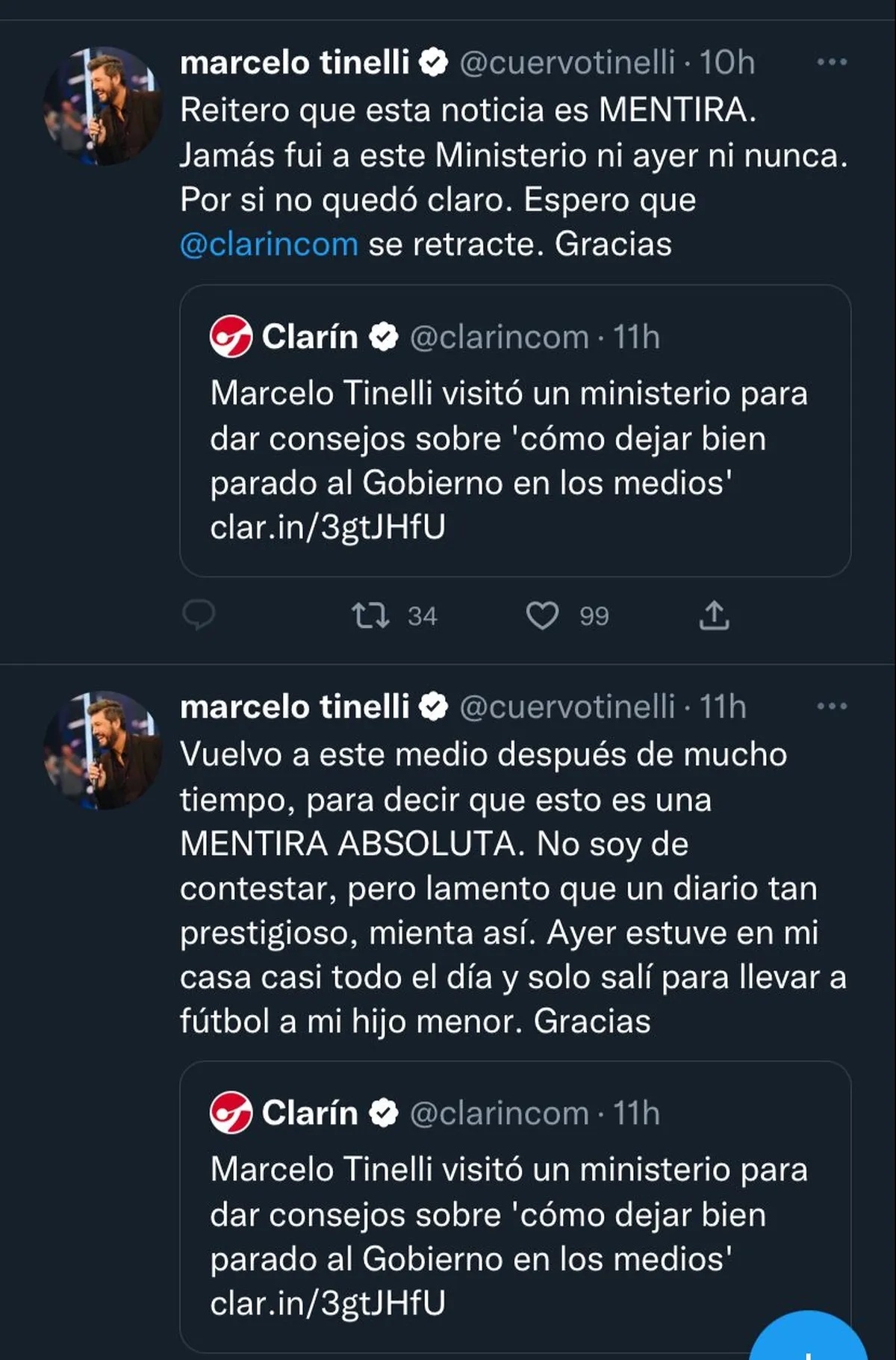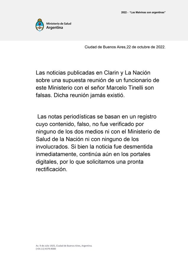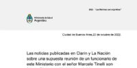 "Las noticias publicadas en Clarín y La Nación sobre una supuesta reunión de un funcionario de este Ministerio con el señor Marcelo Tinelli son falsas. Esa reunión jamás existió", informó este sábado el Ministerio de Salud de la Nación, encabezado por Carla Vizzotti, desde su cuenta oficial de Twitter.