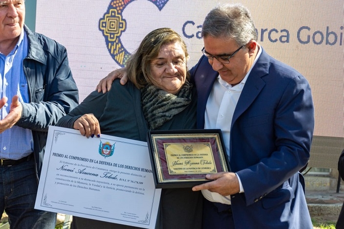 En un acto realizado en Casa de Gobierno, el gobernador Raúl Jalil junto al vicegobernador Rubén Dusso y el ministro de Gobierno, Justicia y Derechos Humanos, Juan Cruz Miranda, entregaron el reconocimiento al “Compromiso en la defensa de los Derechos Humanos", que se le otorgó en esta oportunidad a la presidenta de la Casa de la Memoria, Noemí Toledo.