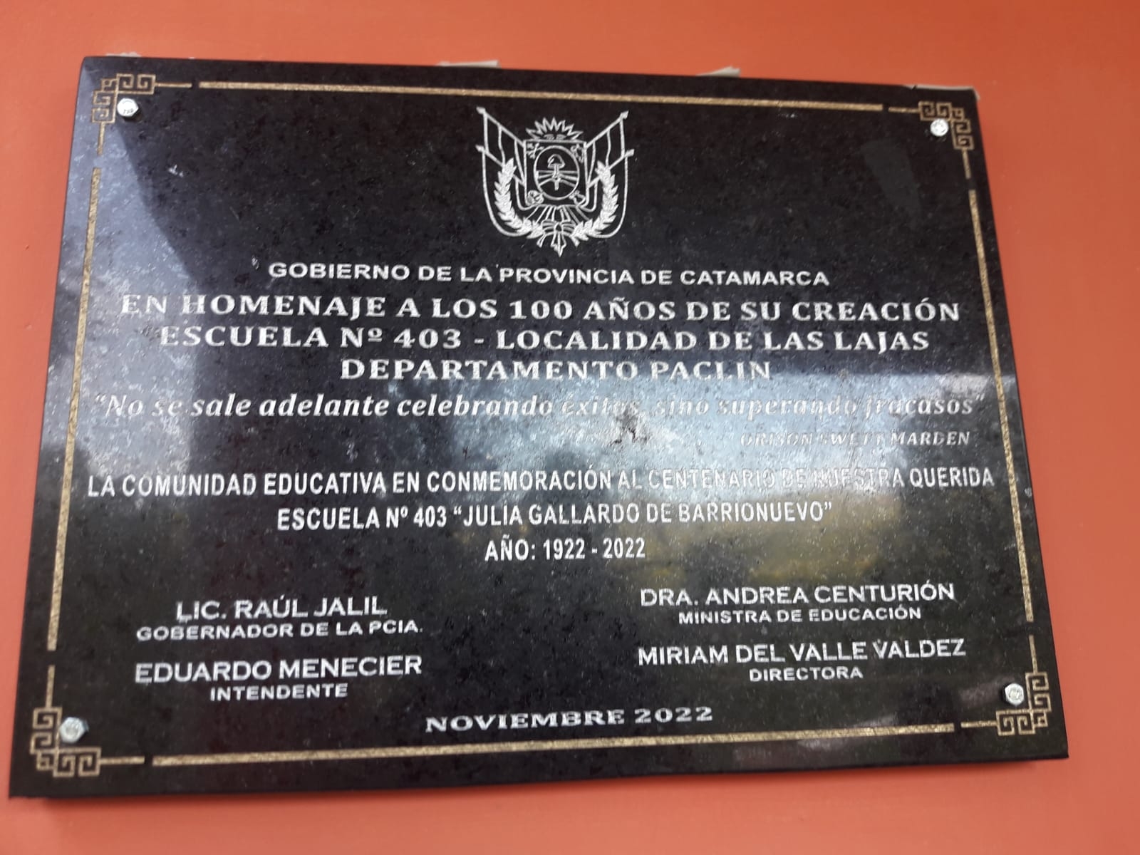 Al hacer uso de la palabra, el supervisor escolar del departamento destacó la significación, en términos de perseverancia y esfuerzo, en el hecho de haber llegado a cien años de vida institucional, mencionó asimismo, que esto solo puede lograrse si escuela y comunidad trabajan en conjunto en el logro de objetivos comunes enfocados en los estudiantes y sus trayectorias escolares. En otro párrafo, agradeció la nutrida concurrencia de la comunidad a la celebración, a quienes invitó a acompañar de manera sostenida a la institución a través de la presencia, de sugerencias, de la participación en la vida escolar.
