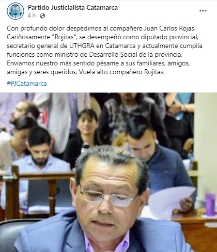 "Con profundo dolor despedimos al compañero Juan Carlos Rojas. Cariñosamente "Rojitas", se desempeñó como diputado provincial, secretario general de UTHGRA en Catamarca y actualmente cumplía funciones como ministro de Desarrollo Social de la provincia. Enviamos nuestro más sentido pésame a sus familiares, amigos, amigas y seres queridos. Vuela alto compañero Rojitas", expresa el comunicado.