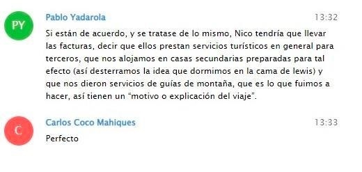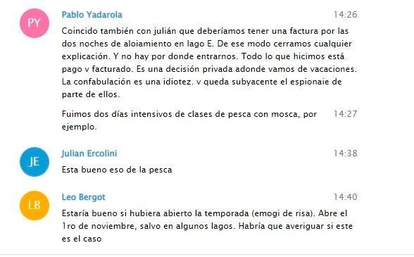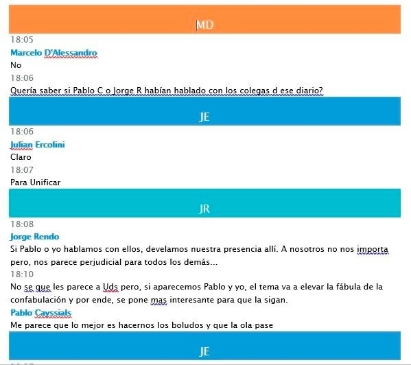 Luego señaló que "ese hecho se habría verificado con antelación al momento en el que los integrantes del 'grupo Operación Página 12' (como se denominaron los partícipes del viaje) se inquietaran por la difusión de la noticia y dialogaran en ese sitio digital buscando quedar impunes"