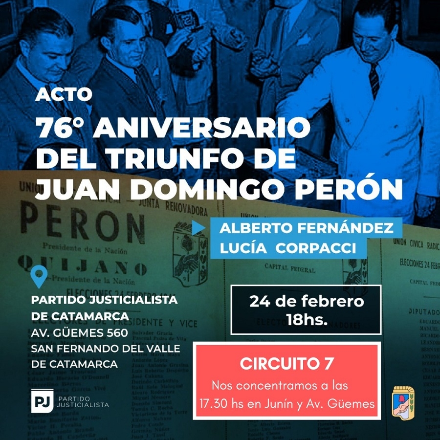 Con la presencia del Presidente del PJ Nacional Alberto Fernández y la Vicepresidenta Lucia Corpacci, este jueves 24 de febrero a las 18 hs. en la sede del Partido Justicialista de la provincia de Catamarca, se recordará la gesta patriótica que significó la llegada de Perón a la Presidencia de la Nación.