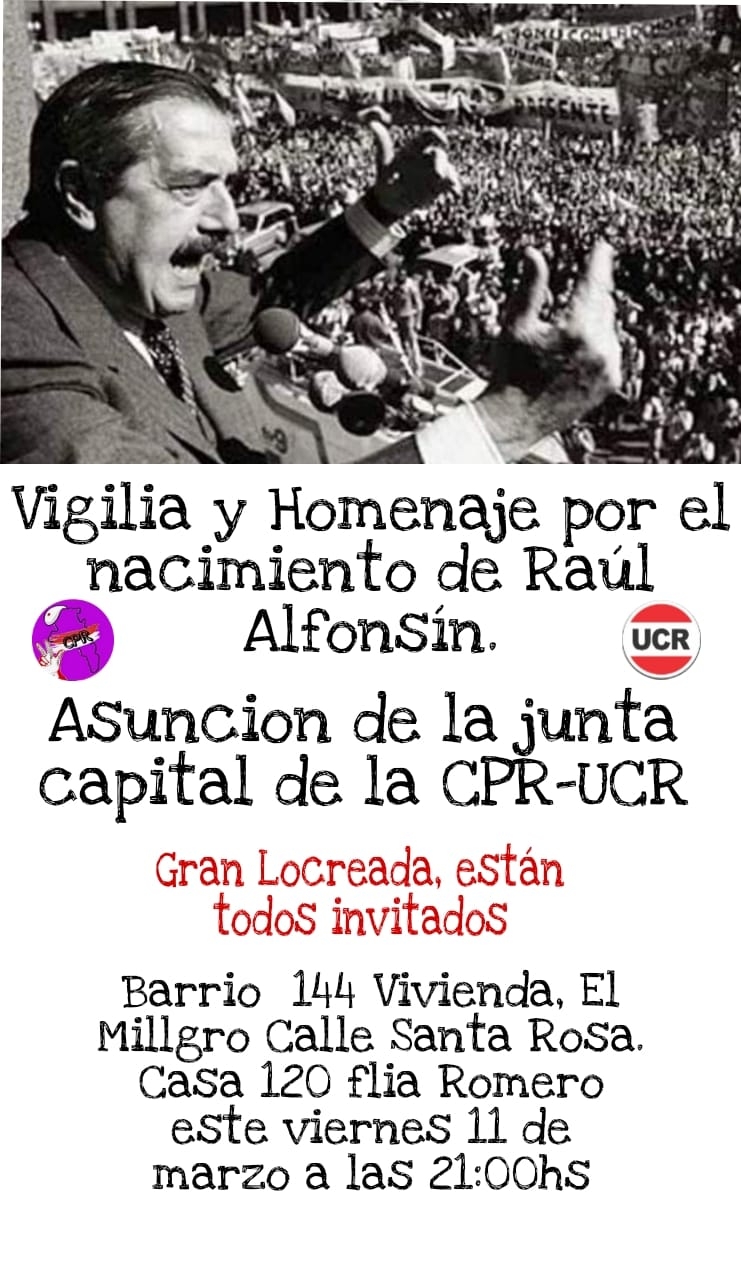 En la jornada de hoy asumen las autoridades de la Corriente Progresista Radical de la Capital. En el mismo, además, se va a realizar una reflexión por el día internacional de la mujer y una vigilia en homenaje a Raul Alfonsin. La finalización del acto, será con una locriada.