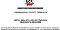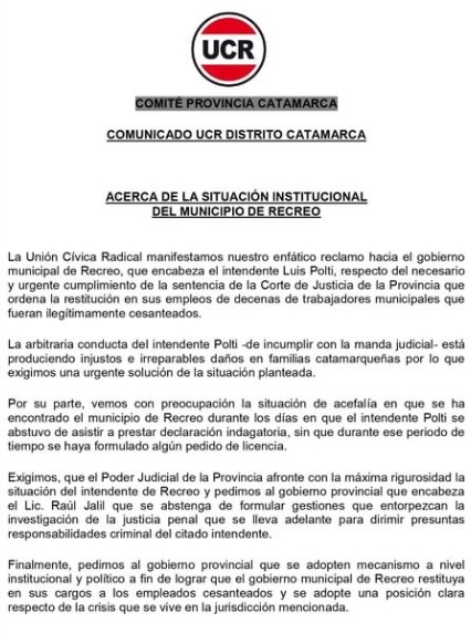 Más tarde, el Comité Provincia del centenario partido también difundió un parte de prensa sobre la "situación institucional en el Municipio de Recreo".