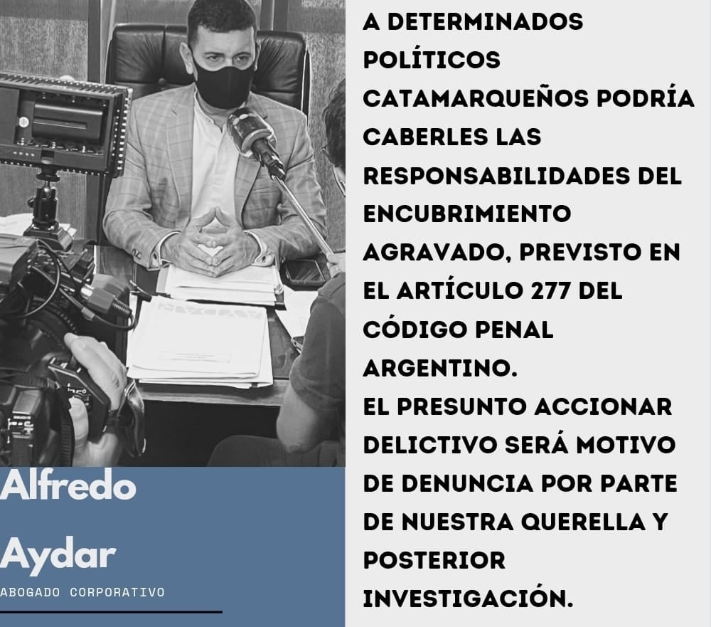También el letrado anunció que como querellante presentará denuncia en contra de "políticos catamarqueños" por el supuesto delito de "encubrimiento agravado" en el marco de la investigación por estafas y demás delitos en contra de financieras locales.