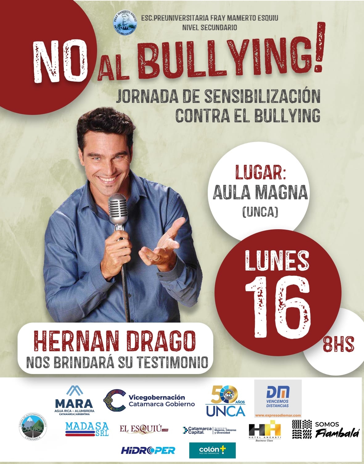 La cita con invitación abierta para toda la comunidad, será en el Aula magna de la Universidad Nacional de Catamarca, donde Drago dará una charla motivacional desde su historia de vida, para compartir su experiencia sobre este flagelo que es el bullying en la juventud. A través de la charla motivacional y los testimonios de catamarqueños y catamarqueñas, toda la familia educativa de la escuela preuniversitaria Fray Mamerto Esquiú se suma a esta lucha para decirle “No al bullying”.
