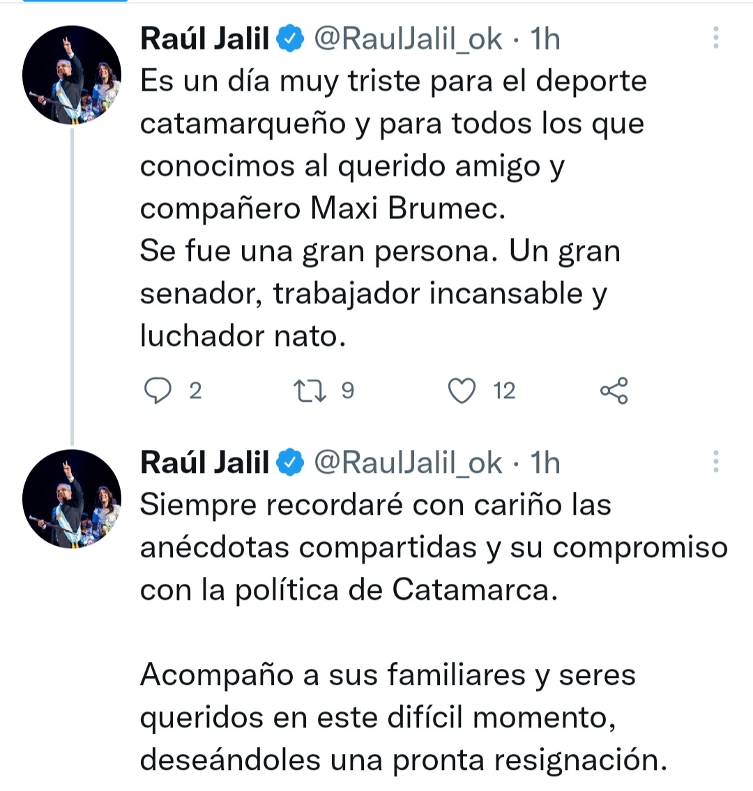 Se fue una gran persona. Un gran senador, trabajador incansable y luchador nato", gobernador, Raúl Jalil.