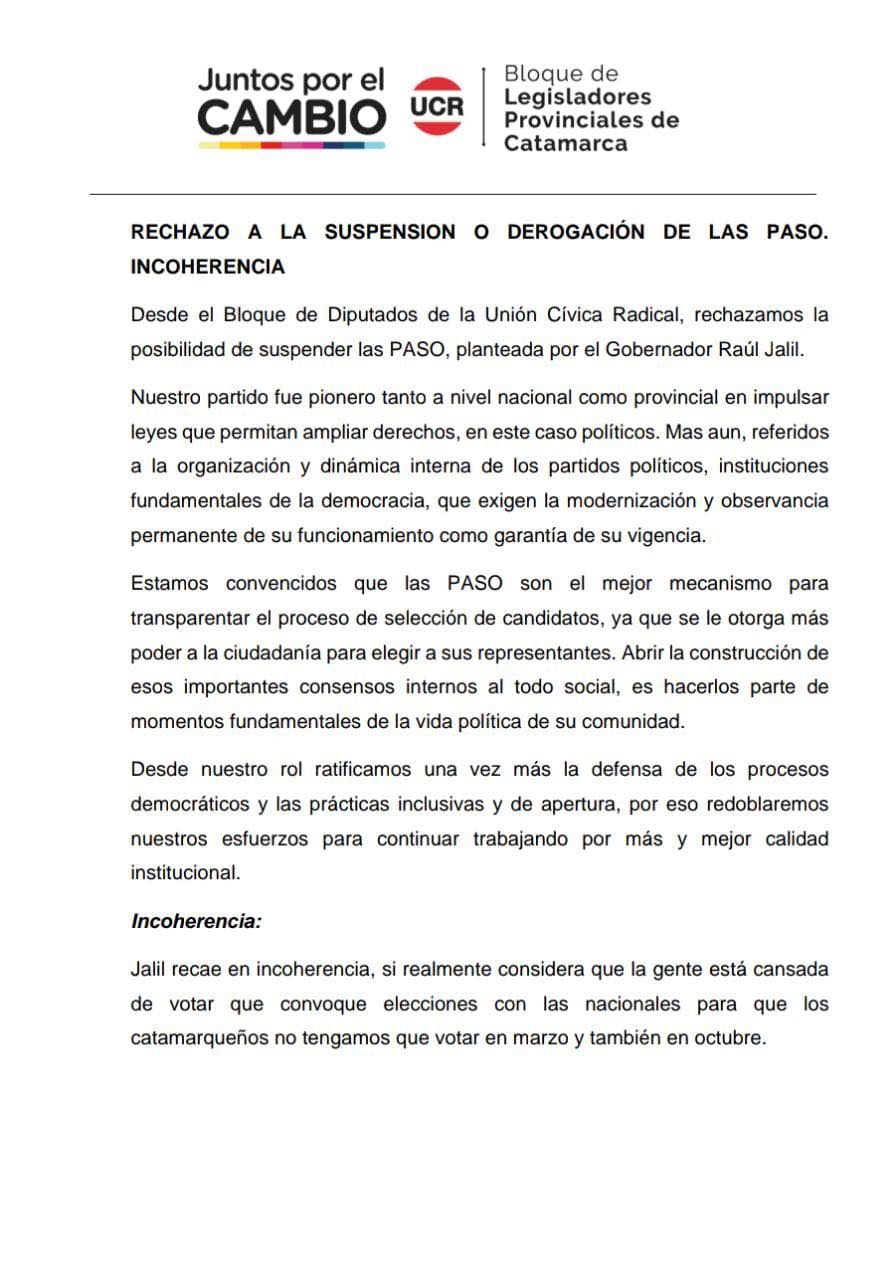 A través de un comunicado, expresaron que "estamos convencidos que las PASO son el mejor mecanismo para transparentar el proceso de selección de candidatos ya que se le otorga más poder a la ciudadanía para elegir a sus representantes".