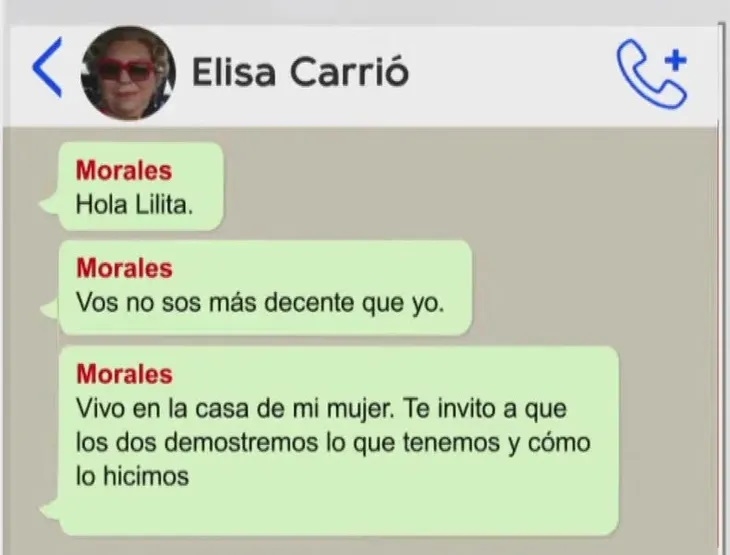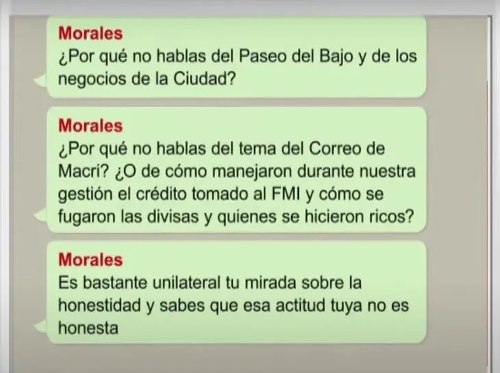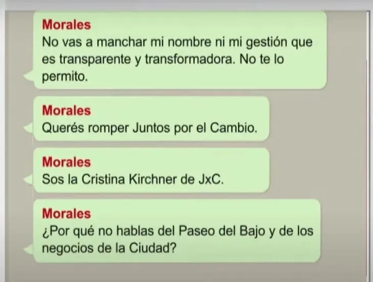 A través de una serie de mensajes de WhatsApp que se hicieron públicos, Morales le espetó una serie de reclamos y respuestas a sus críticas. Entre ellos, le dice a la dirigente que es "la Cristina Kirchner de JxC".
