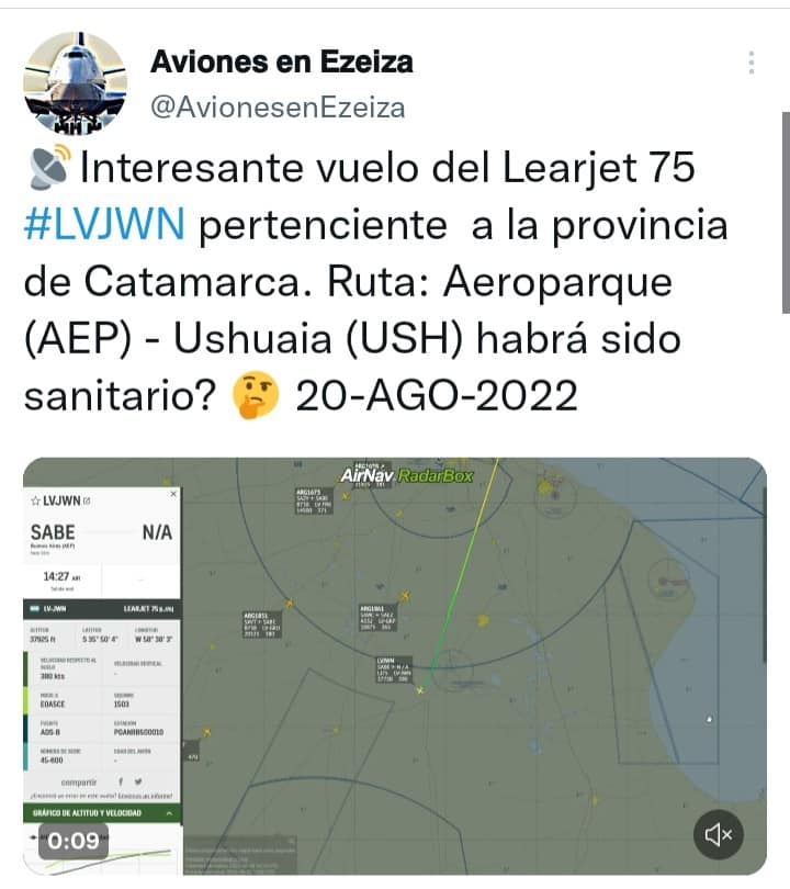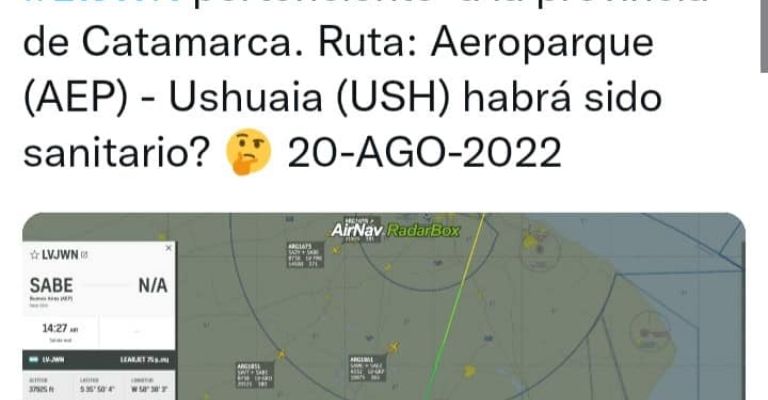 El avión sanitario despegó ayer de Aeroparque Jorge Newbery a las 2:27P.M. y aterrizó en el Aeropuerto Internacional Malvinas Argentinas de Ushuaia a las 5:54 P.M. El tiempo total de vuelo fue de 3 horas 27 minutos. Este domingo la aeronave Learjet 75 perteneciente a la provincia de Catamarca emprendió vuelo a las 12: 36 desde el Aeropuerto Internacional Malvinas Argentinas de Ushuaia con destino a Aeroparque Jorge Newbery.
