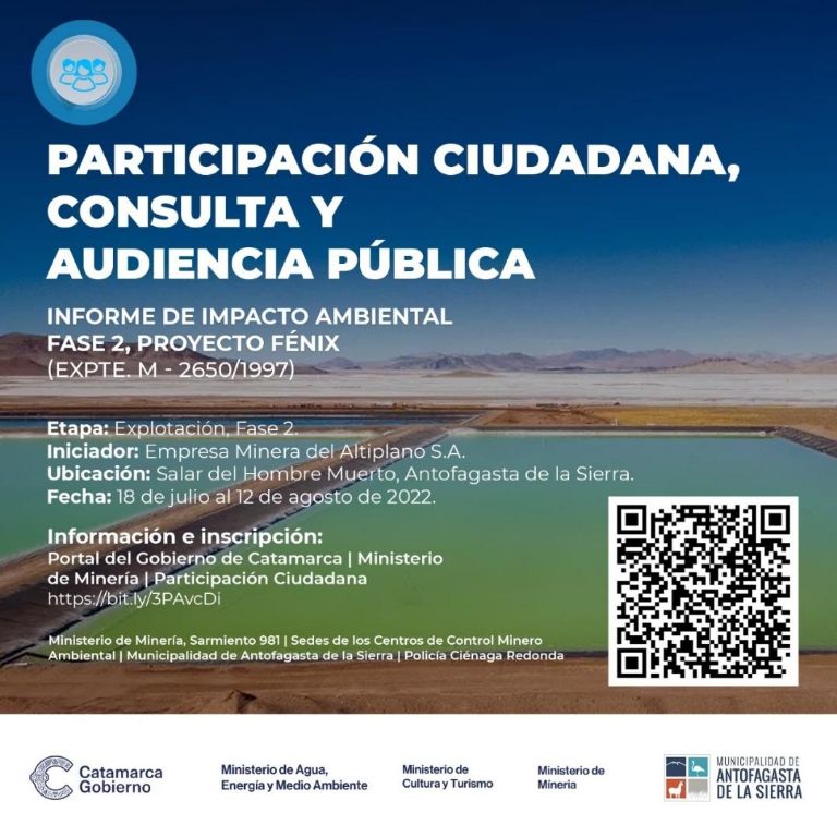 Desde el 18 de julio al 12 de agosto se concretará el proceso de Participación Ciudadana consulta y audiencia pública para el Informe de Impacto Ambiental proyecto Fénix, etapa de expansión fase II, iniciado por Minera del Altiplano SA (Livent). Se trata del único productor de litio con que cuenta la Provincia. Está ubicado en Antofagasta de la Sierra, en el Salar del Hombre Muerto, y está próximo a iniciar la etapa de expansión, para la cual requiere la aprobación y autorización del organismo minero, previa consulta y audiencia pública llevada a cabo por el Equipo Evaluatorio Interinstitucional (Ministerio de Agua, Energía y Ambiente y Ministerio de Cultura y Turismo), a través de la Dirección Provincial de Gestión Ambiental Minera, del Ministerio de Minería.