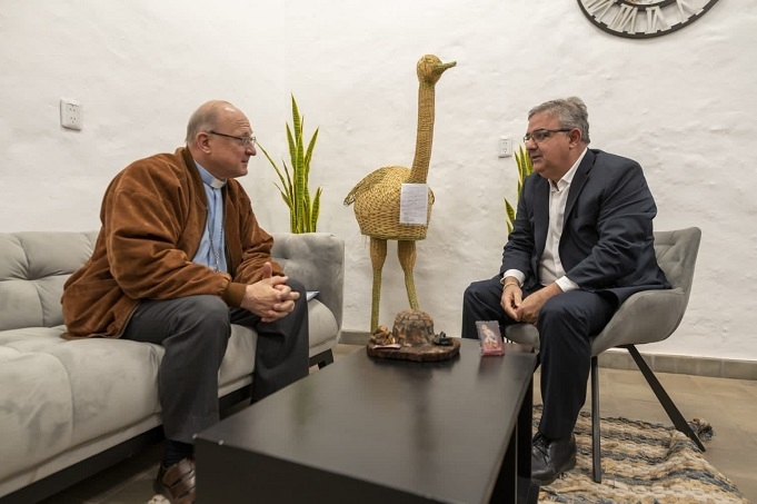 Durante la reunión, el mandatario junto con Monseñor Urbanc, analizaron el avance de las obras dentro del proyecto global que se inicia en el Camino del Peregrino, la Plaza de la Virgen y el Santuario.