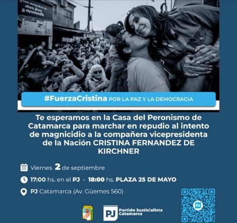 Tras el intento de asesinato a la Vice Presidenta de la Nación, Cristina Fernández, el Partido Justicialista de Catamarca convoca a la militancia a las 17 horas frente a la sede de avenida Guemes.