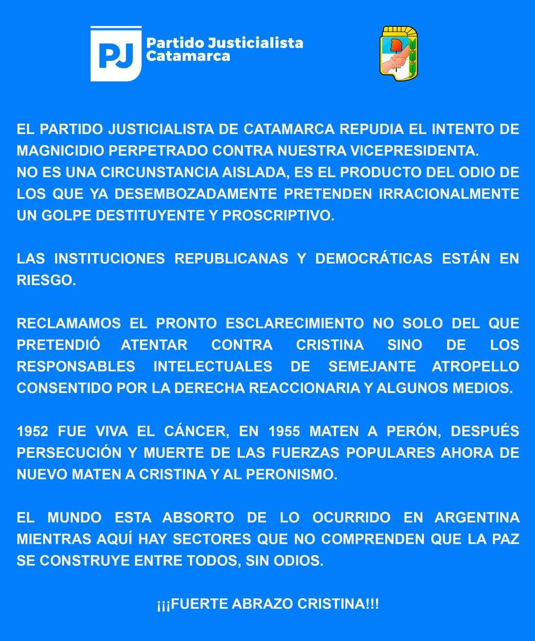 El Partido Justicialista de Catamarca repudió el atentado contra la vicepresidenta de la Nación, Crisitina Fernández, y expresó que lo sucedido no es un hecho aislado, sino que es producto del odio de quienes pretenden un golpe destituyente y proscriptivo.