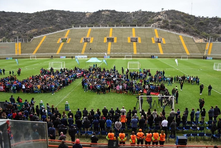 El acto estuvo lleno de color y risas, que la aportaron más de 600 chicos de escuelas de fútbol y ligas de diversos departamentos de la provincia que disfrutaron a pleno al poder pisar el césped recuperado del Coloso de la Loma en una mañana de integración deportiva.