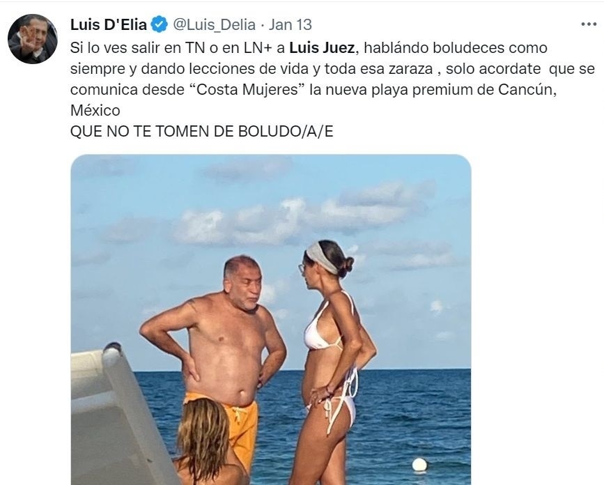 "Si lo ves salir en TN o en LN+ a Luis Juez, hablando boludeces como siempre y dando lecciones de vida y toda esa zaraza, solo acordate que se comunica desde 'Isla Mujeres' la nueva playa premium de Cancún, México. Que no te tomen de boludo", afirmó el líder social.