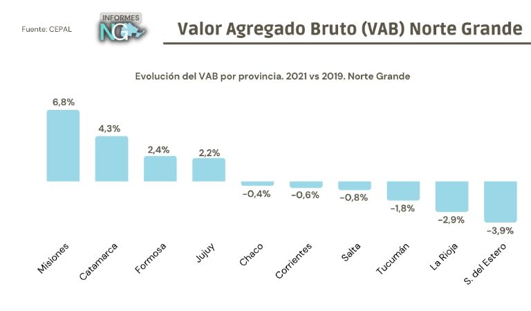 En este marco cabe preguntarse como fue la evolución de las provincias argentinas y en particular, las del Norte Grande. Si bien a nivel provincial no se tienen datos mensuales de la evolución de su producto geográfico, el documento elaborado por la CEPAL junto al Ministerio de Economía de la Nación denominado “Desagregación provincial del valor agregado bruto de la Argentina” permite observar la evolución anual de las economías del Norte, hasta el 2021 inclusive.