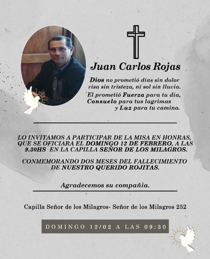 El oficio tuvo lugar en la capilla del “Señor de los Milagros” del B° de Choya en esta Capital, donde un importante número de fieles colmó el recinto religioso, “conmemorado los dos meses del fallecimiento de nuestro querido Rojitas”, como señalaba la convocatoria de familiares y empleados locales del sindicato Gastronómico.