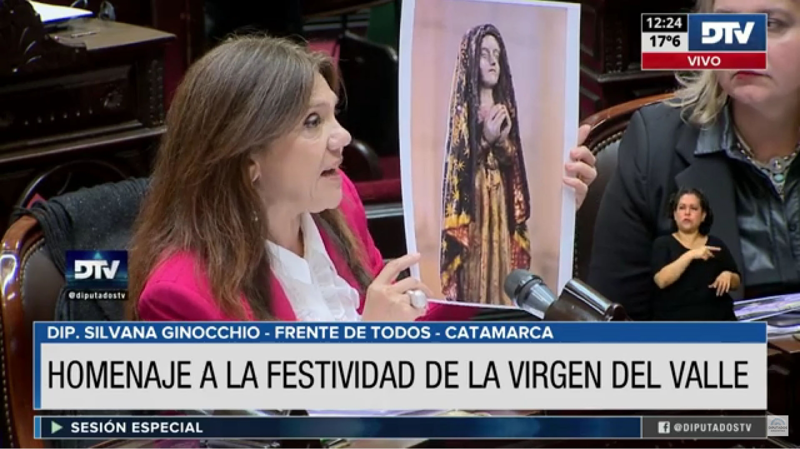 La diputada Silvana Ginocchio realizó un homenaje a las festividades de la Virgen del Valle que se están realizando -la procesión será el domingo 25 de abril-, y resaltó que la devoción popular por la Virgen “está absolutamente ligada a la historia de la provincia de Catamarca, es anterior a su fundación”. Este mes se cumplen 132 años de la coronación pontificia realizada en 1891.
