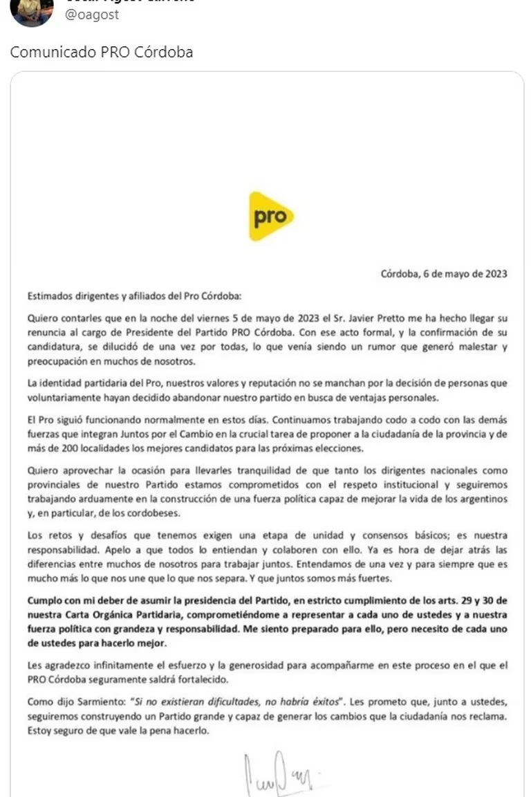 La intendenta de la UCR de Estación Juárez Celman, en uso de licencia, lo confirmó a Cadena 3. El expresidente del PRO en Córdoba buscará ser viceintendente por el oficialismo. Llamosas irá como primer legislador.