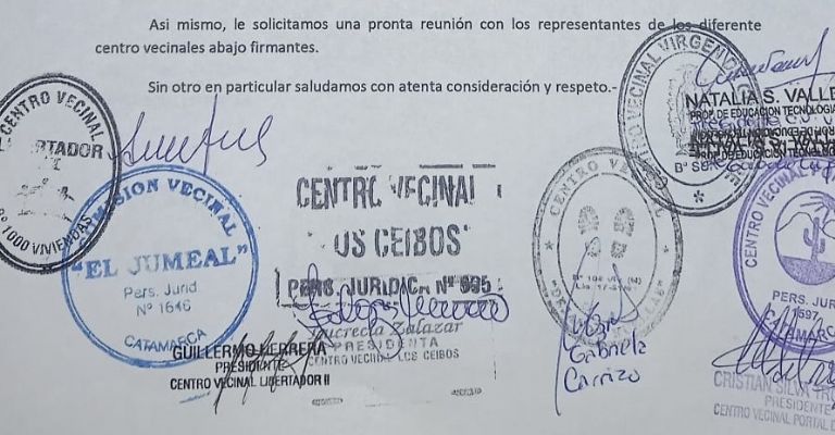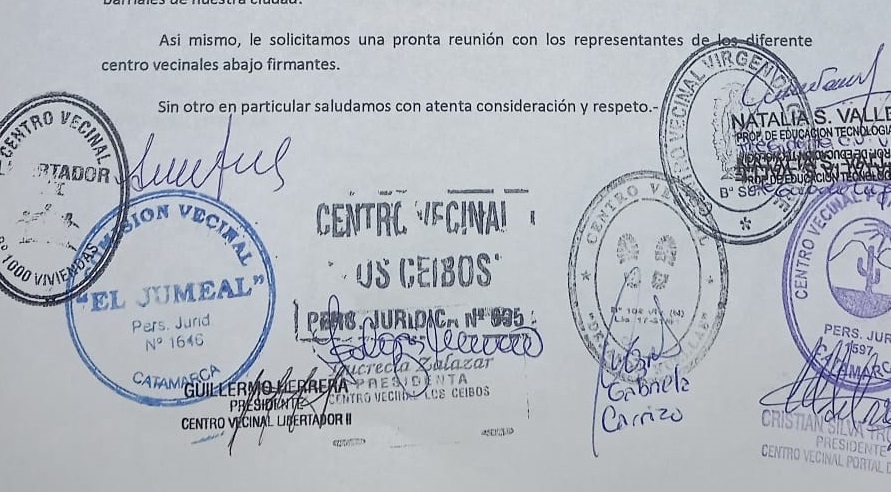 Asi mismo, le solicitamos una pronta reunión con los representantes de los centros vecinales abajo firmantes.