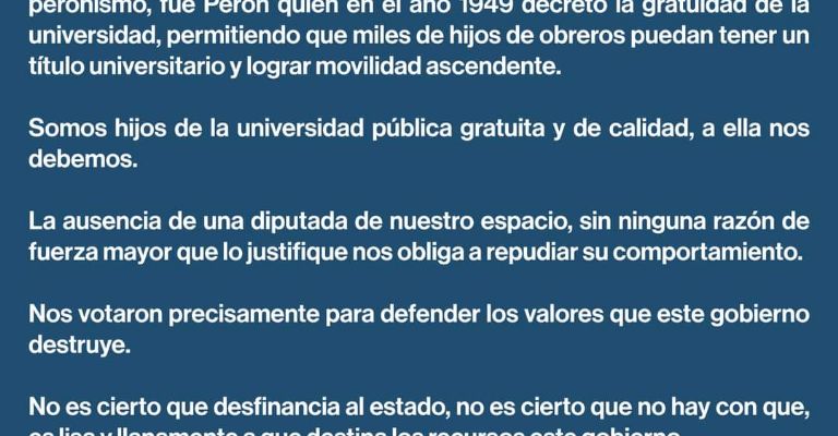 "La ausencia de una diputada de nuestro espacio sin ninguna razón de fuerza mayor que lo justifique, nos obliga a repudiar su comportamiento", expresa un comunicado oficial del PJ Catamarca.