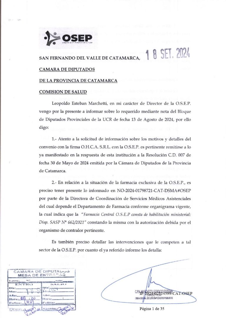 Sin embargo, se aclara que todas las peticiones difundidas tanto en redes sociales como en medios de comunicación por parte del bloque de diputados radical fueron respondidas en su totalidad en un informe escrito de 36 páginas mediante Nota IF-2024-02514599-CAT-OSEP ingresada por Mesa de Entradas de la Cámara de Diputados de la provincia el día 18 de septiembre de 2024.