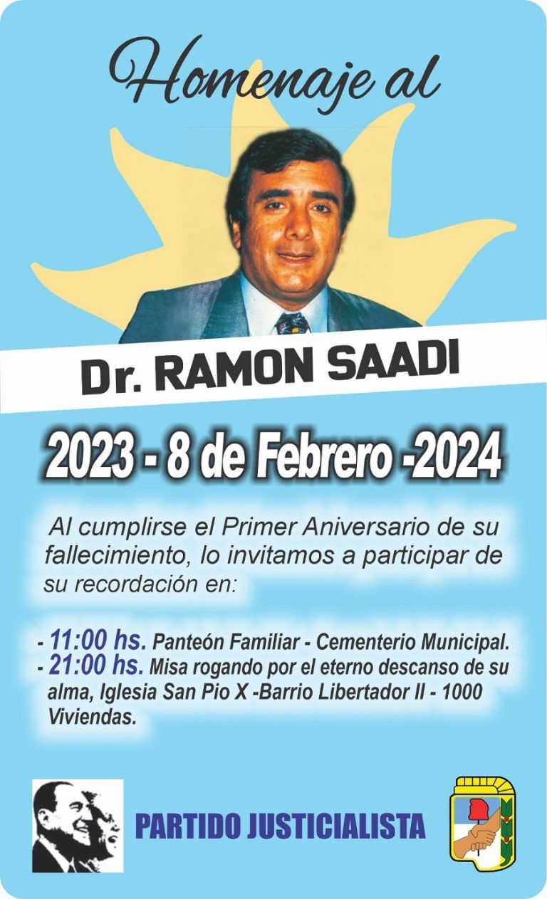 Fallecido el 8 de febrero del 2023, este jueves a las 11:00 hs habrá un homenaje a su memoria en el panteón familiar del Cementerio Municipal, y, posteriormente, una misa rogando por el eterno descanso de su alma en la iglesia San Pío X, del B° Libertador II (Mil Viviendas).