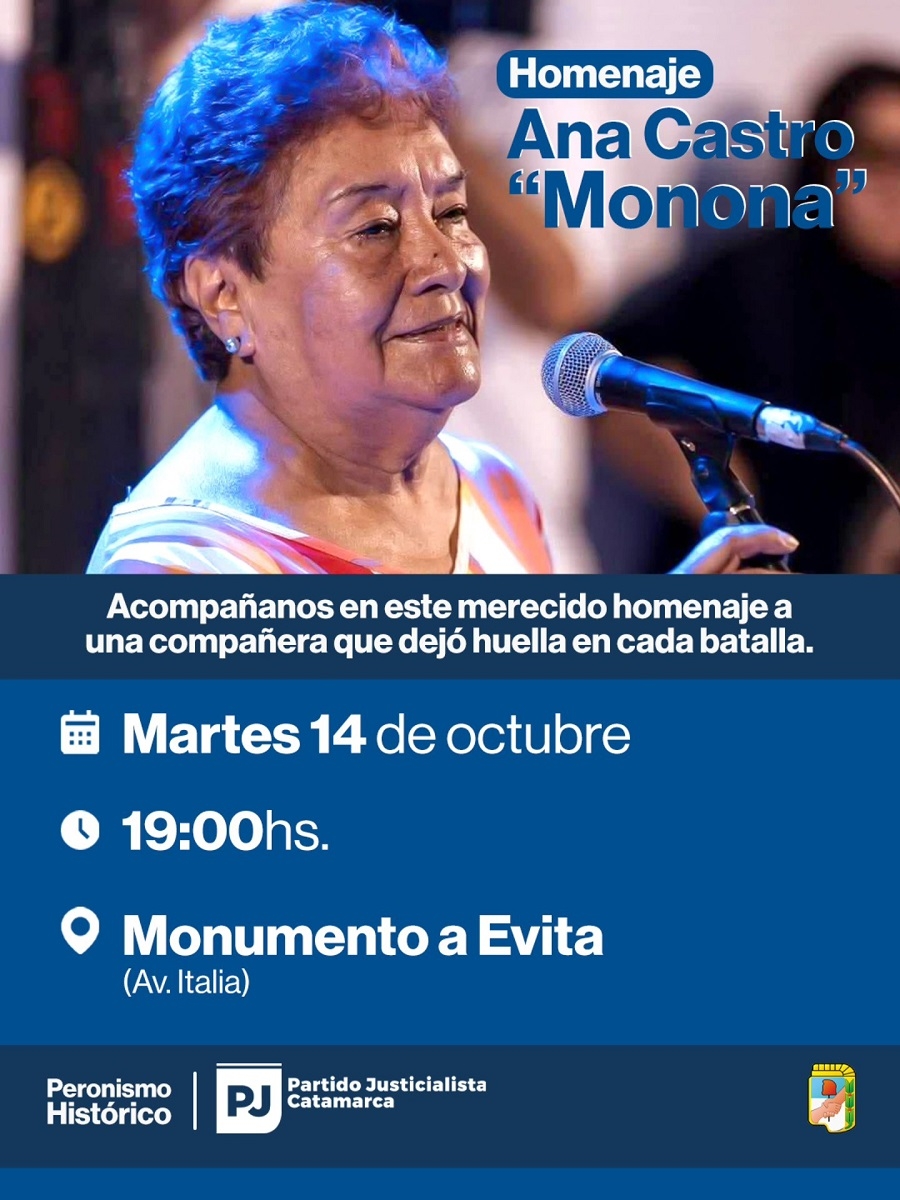 La convocatoria del PJ invita a “compañeras y compañeros a rendir homenaje a una mujer imprescindible de nuestra historia militante”, remarcando que “Monona fue compromiso, entrega y amor por Catamarca”, para sentenciar que “su ejemplo nos sigue marcando el camino de la lealtad y la lucha colectiva”.