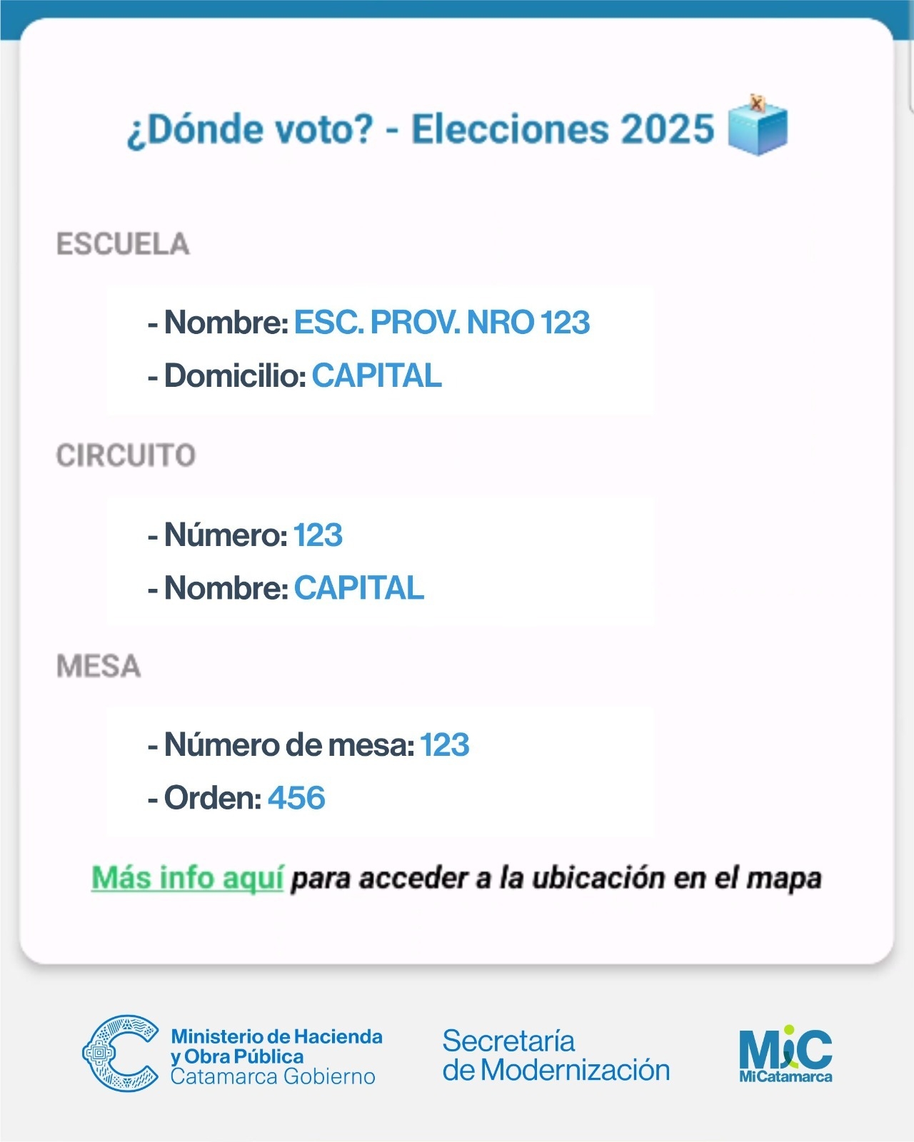 En este caso, una vez descargada la aplicación en el teléfono celular, basta con ingresar a la misma con usuario (es el número de CUIL) y contraseña para que aparezcan en pantalla los datos de Escuela, ubicación, Circuito, Mesa y Orden que son necesarios para presentarse al lugar de votación, junto con el DNI físico. Asimismo, la ubicación puede ser consultada en un mapa interactivo que facilita al usuario la experiencia.
