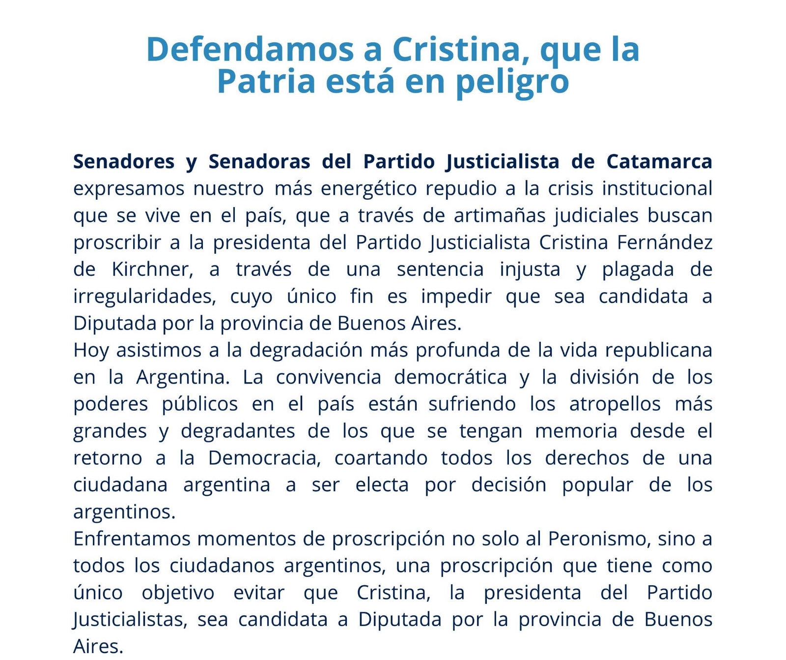En otro tramo, apuntan: “Enfrentamos momentos de proscripción no solo al Peronismo, sino a todos los ciudadanos argentinos, una proscripción que tiene como único objetivo evitar que Cristina, la presidenta del Partido Justicialista, sea candidata a Diputada por la provincia de Buenos Aires.