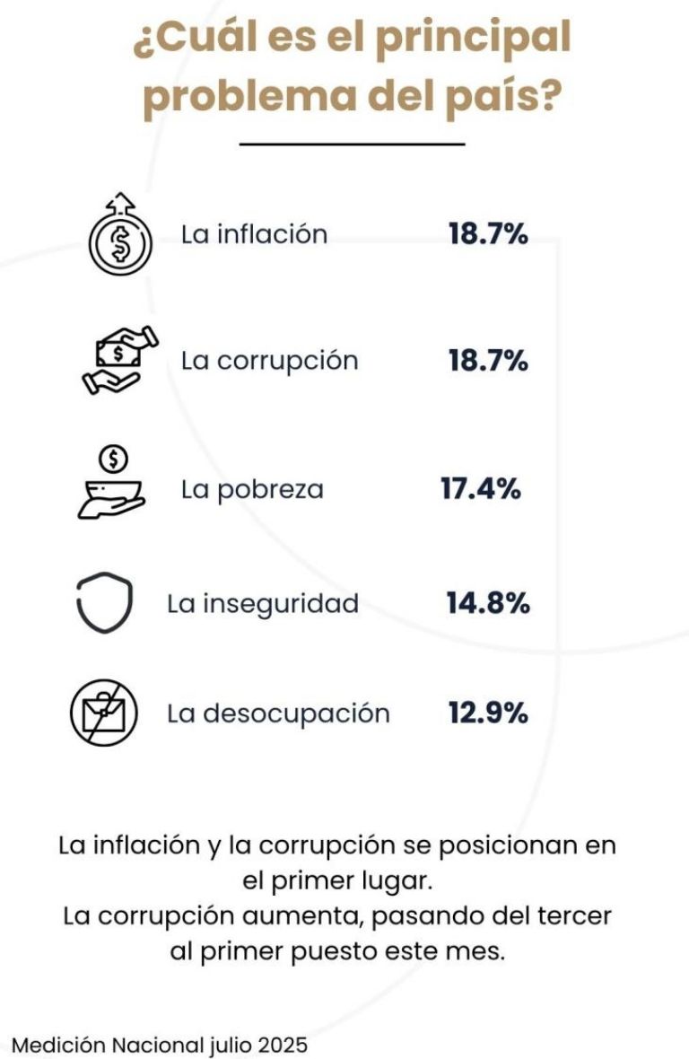 La corrupción volvió a posicionarse como la principal preocupación de los argentinos (21,7%), por encima de la inflación y la inseguridad, que empataron en un 17,1%.