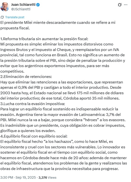 En su posteo, el cordobés rechazó la imputación libertaria y expuso los ejes de su programa: una reforma tributaria sin aumentar la presión fiscal, la eliminación de retenciones, la lucha contra la evasión y un equilibrio fiscal que, subrayó, debe estar acompañado de equilibrio social.