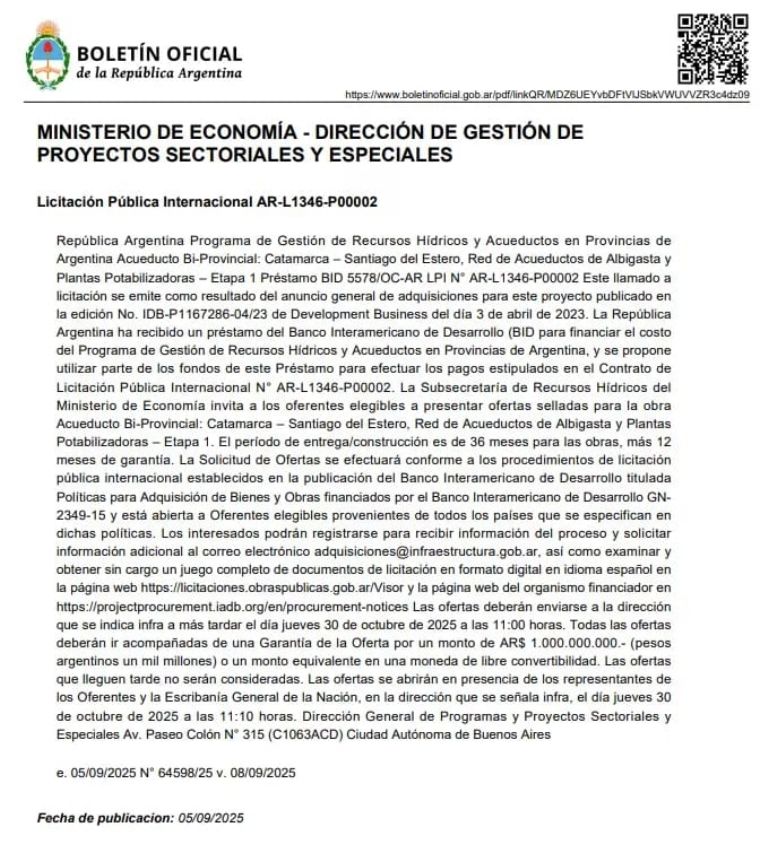 El Ministerio de Economía de la Nación, a través de la Secretaría de Obras Públicas, oficializó este viernes el llamado a licitación para la construcción del Acueducto Albigasta, una obra estratégica que impactará directamente en la calidad de vida de miles de familias en Catamarca y Santiago del Estero.